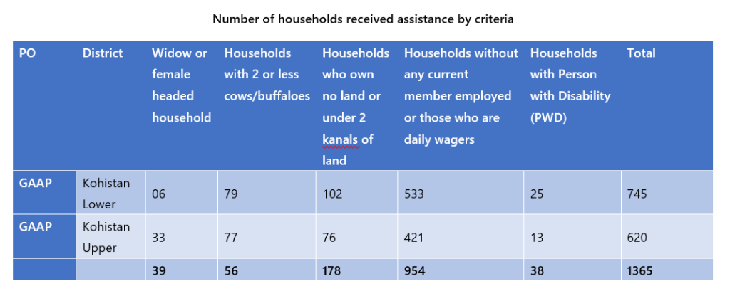 Kohistan one of the most vulnerable, destitute & challenging area of KPK, Pakistan. More than 70% of population is living below poverty line facing massive challenges to meet the fundamental needs of daily life.  In Kohistan majority of the population mostly depend on daily wages work, livestock and small-scale agriculture in available land in targeted UCs. Regarding the agriculture and livestock sector, although no one during the time of data collection claimed to be affected from the crisis in the short term but the focus group discussions pointed towards exacerbating difficulties of farming community in the medium to long term. The agriculture producers especially small agri and farm holders are confronted with issues related to farm inputs for the coming season to keep continue the economic cycle as most farmers have utilized their savings and seeds kept for the khareef season.Based on the above analysis the project reached out to approximately 1365 households in 02 UCs of Upper Kohistan and Lower Kohistan. GAAP targeted both UCs with the technical & financial support of PPAF in given time frame and assisted 1365 targeted HHs/Families in COVID-19 emergency response, project bring their lives towards economic revival of targeted HHs in the area through multi-dimensional approaches.